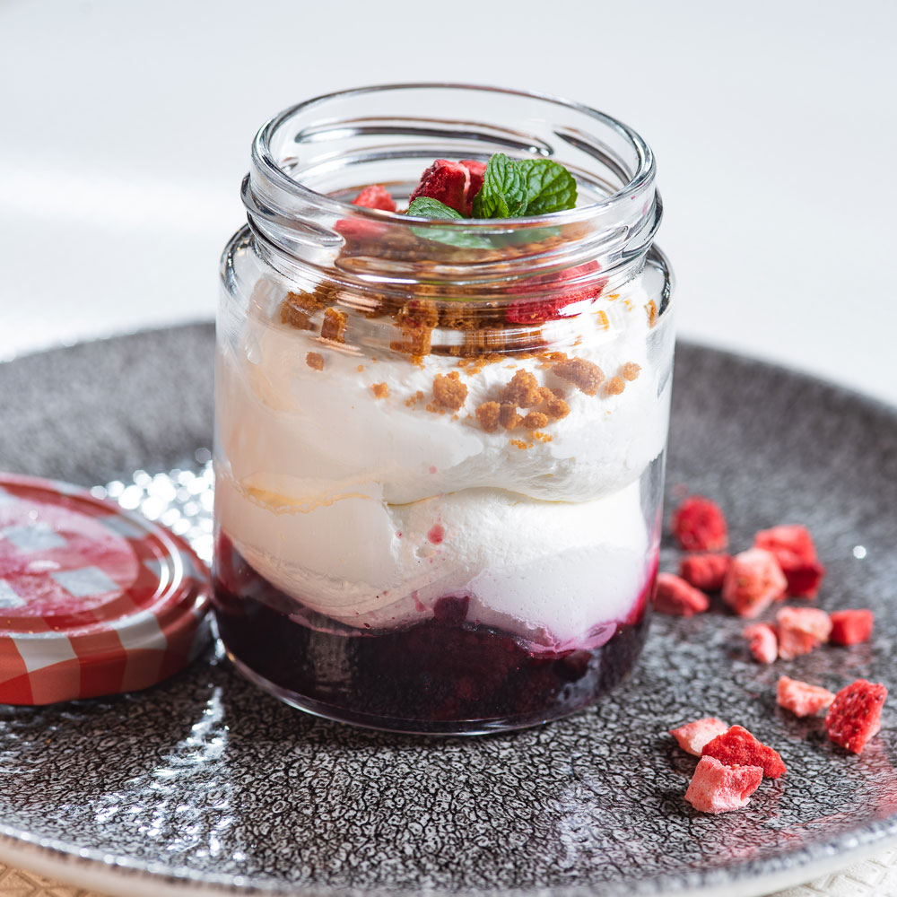 Mousse de yogurt griego con crumble y mermelada de arándanos